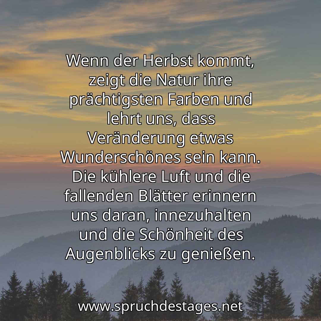 Unser heutiger Spruch des Tages ist: „Wenn der Herbst kommt, zeigt die Natur ihre prächtigsten Farben und lehrt uns, dass Veränderung etwas Wunderschönes sein kann. Die kühlere Luft und die fallenden Blätter erinnern uns daran, innezuhalten und die Schönheit des Augenblicks zu genießen.“