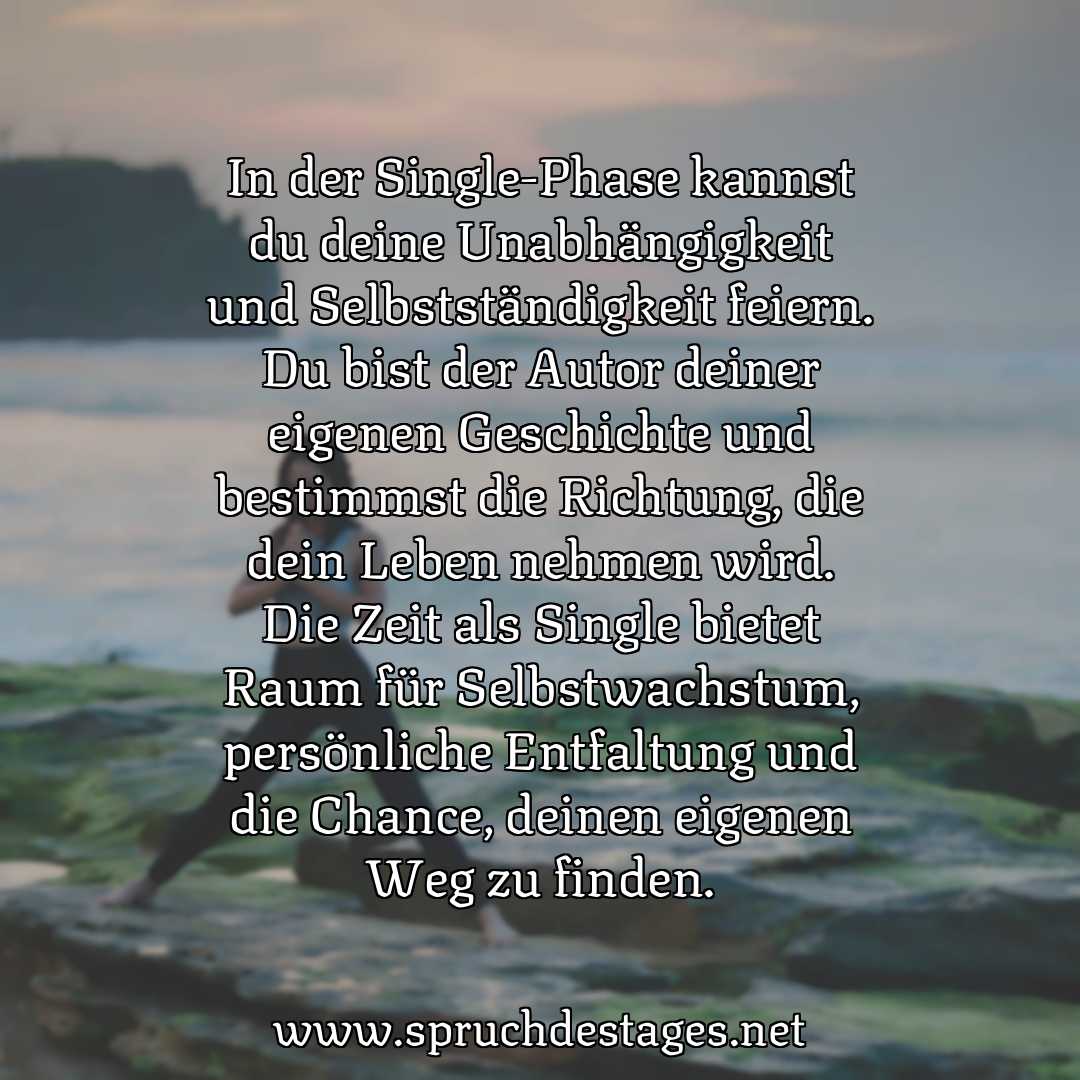 Unser heutiger Spruch des Tages ist: „In der Single-Phase kannst du deine Unabhängigkeit und Selbstständigkeit feiern. Du bist der Autor deiner eigenen Geschichte und bestimmst die Richtung, die dein Leben nehmen wird. Die Zeit als Single bietet Raum für Selbstwachstum, persönliche Entfaltung und die Chance, deinen eigenen Weg zu finden.“